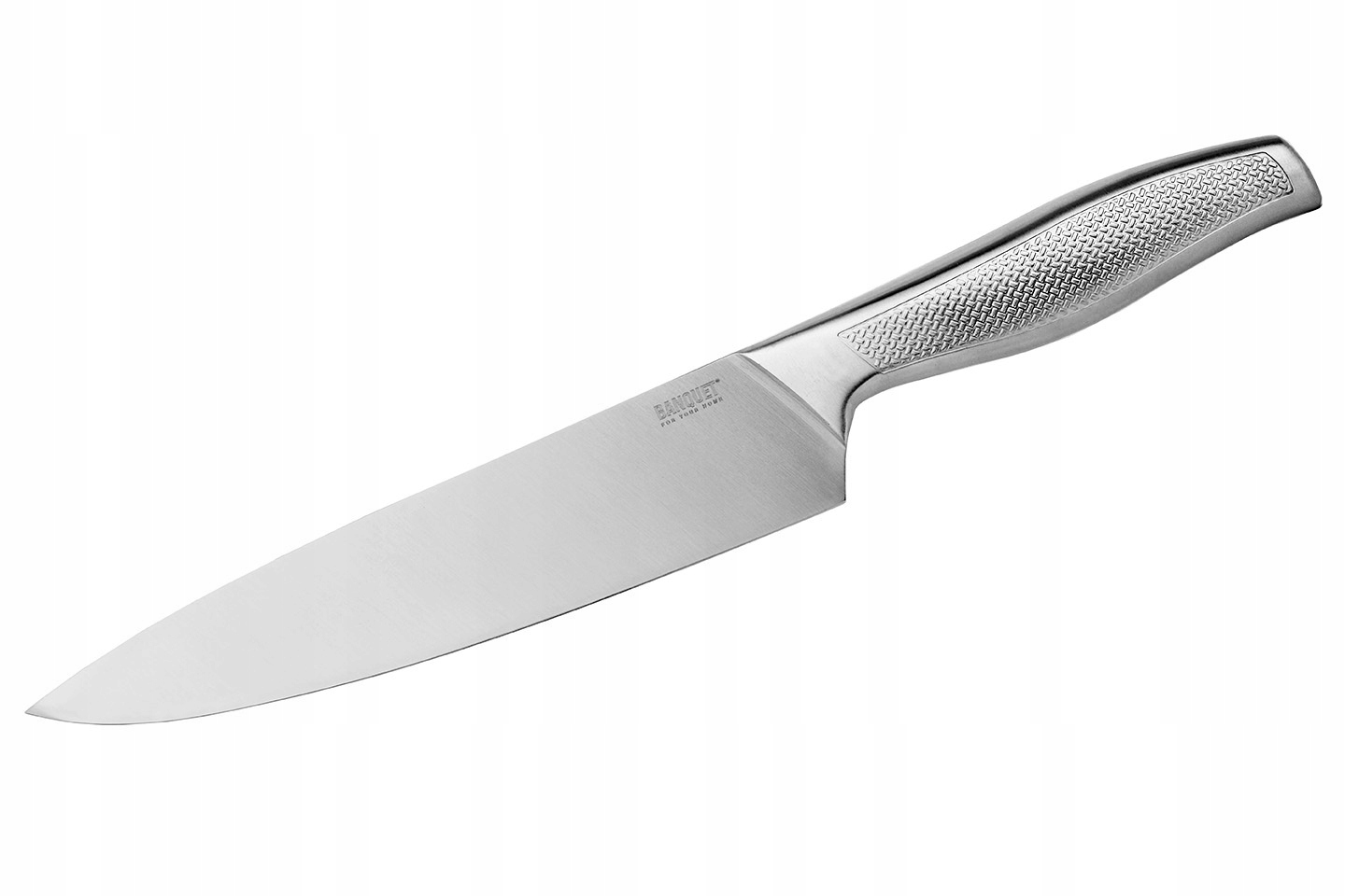 Nóż szefa kuchni METALLIC to produkt najwyższej jakości, który w całości został wykonany ze stali nierdzewnej. Ergonomiczny kształt rękojeści oraz antypoślizgowa powierzchnia sprawiają że nóż dobrze trzyma się w dłoni, zapewniając wygodę i bezpieczeństwo podczas przygotowywania potraw. Doskonale wyważony.