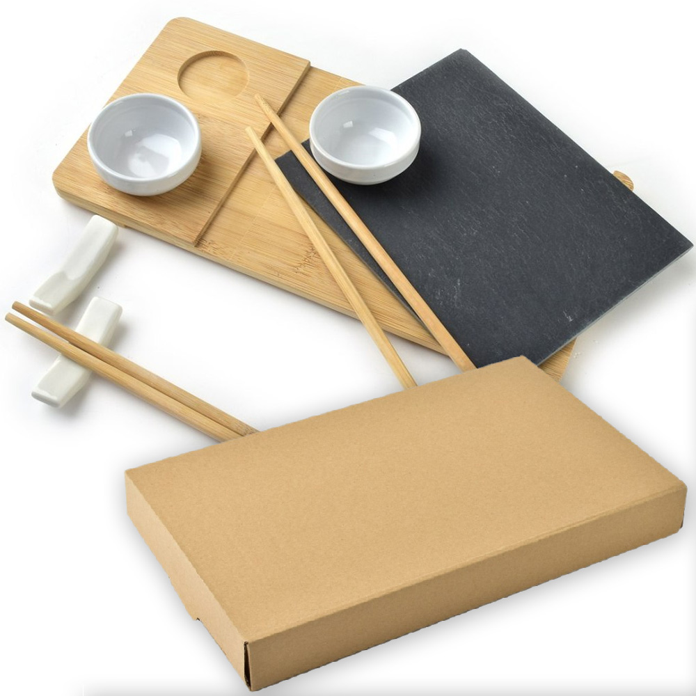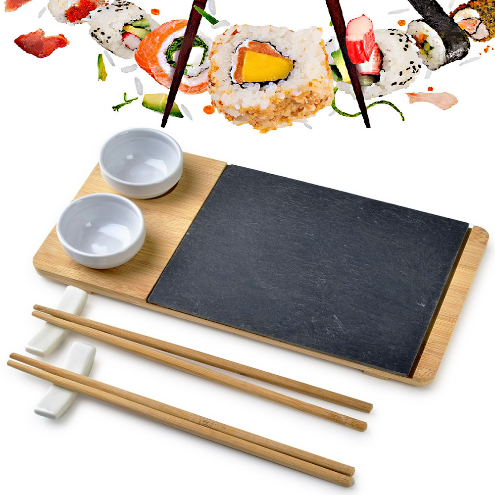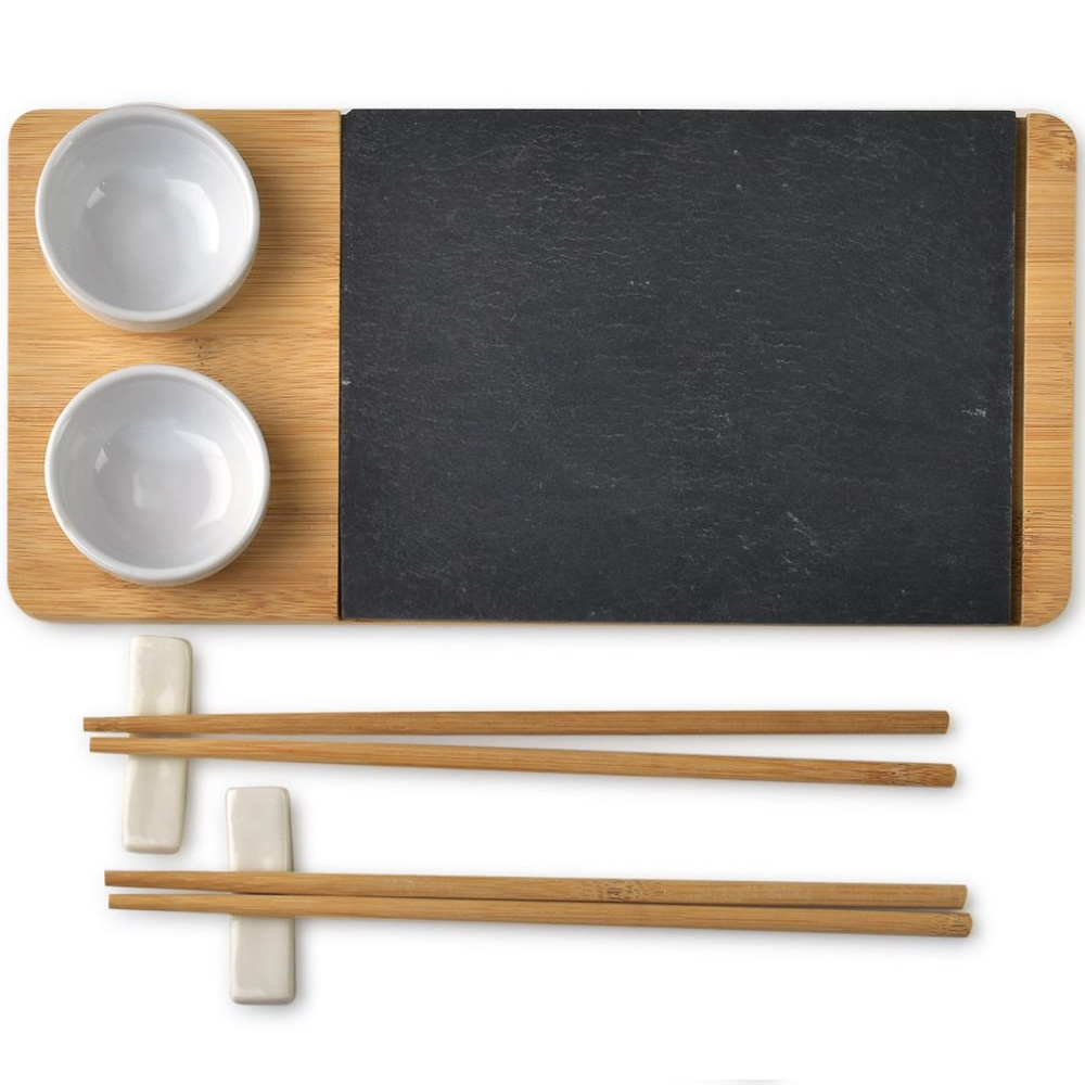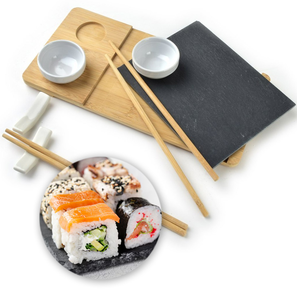 Produkt sprzedawany jest w zestawie: 2 komplety pałeczek, deska drewniana, 1 x deska łupek, 2 podstawki pod pałeczki, 2 miseczki.
